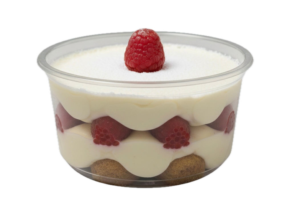 Framboises fraîches du Pays basque sur un lit de crème vanillée et noix de coco, parsemé d'éclats d'amande torréfiée.