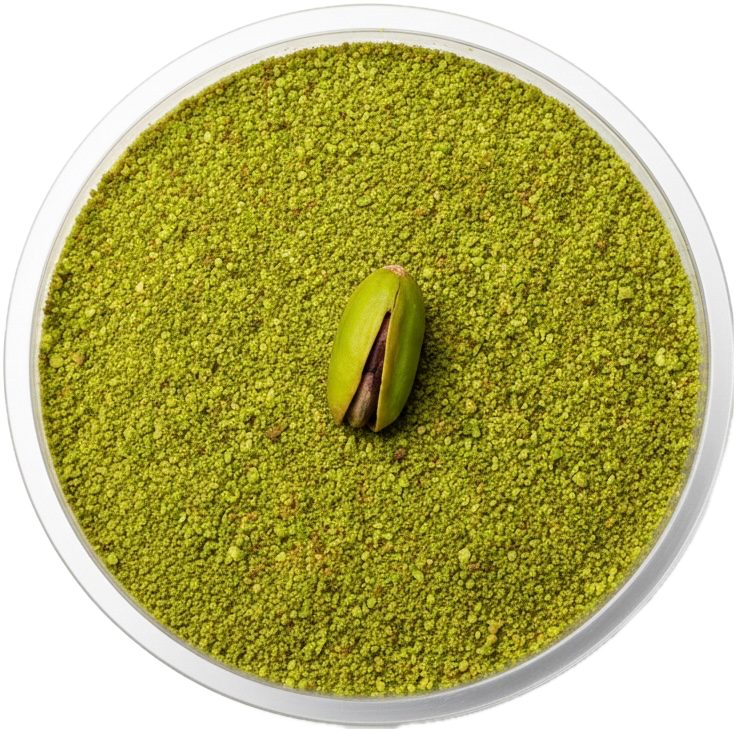 Crème de pistache de Sicile sur un lit de mascarpone aérien, parsemée d'éclats de pistache torréfiée et d'un voile de fleur d'oranger.